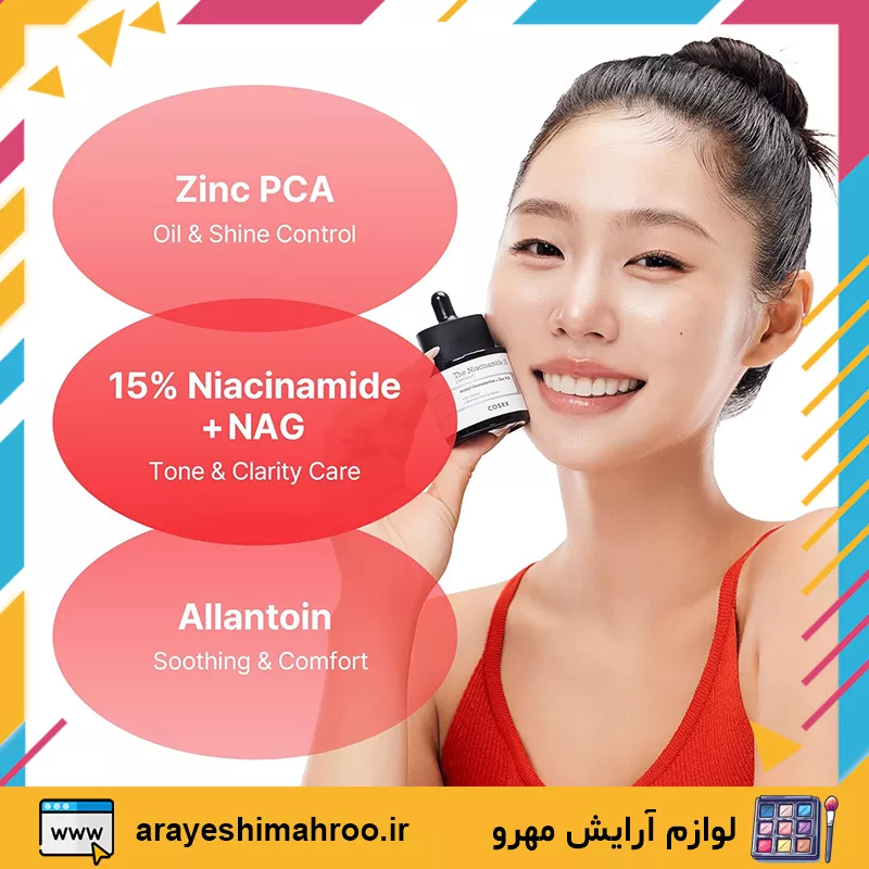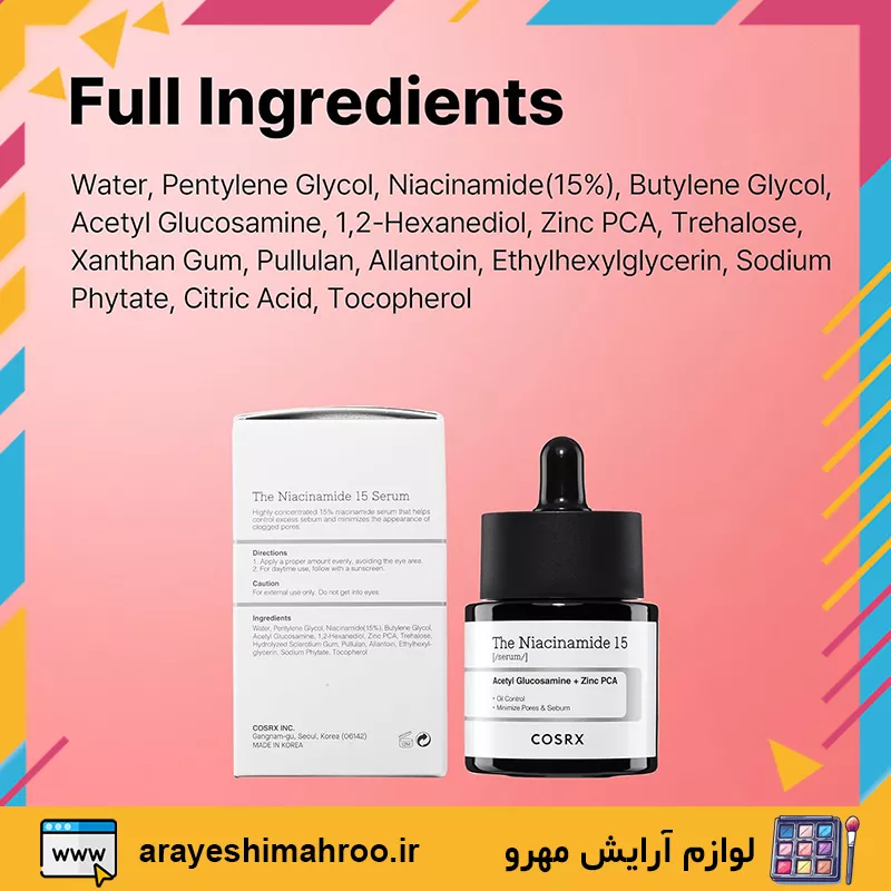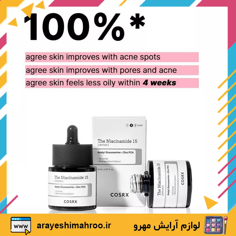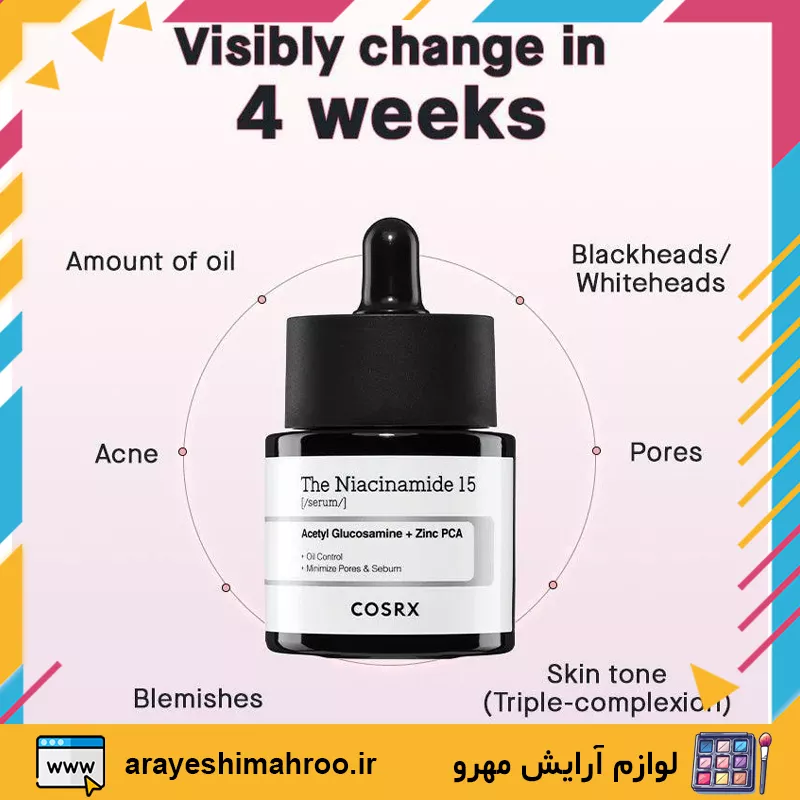 سرم نیاسینامید کوزارکس COSRX 15% Niacinamide Face Serum برای کنترل چربی، کاهش منافذ باز و بهبود جای جوش با غلظت بالای ۱۵ درصد نیاسینامید و ترکیبات هم افزایی مانند زینک PCA و N-Acetyl Glucosamine فرموله شده تا به طور هدفمند میزان چربی پوست را تنظیم کرده، ظاهر منافذ را کوچکتر کند و رنگ پوست را یکنواخت سازد.